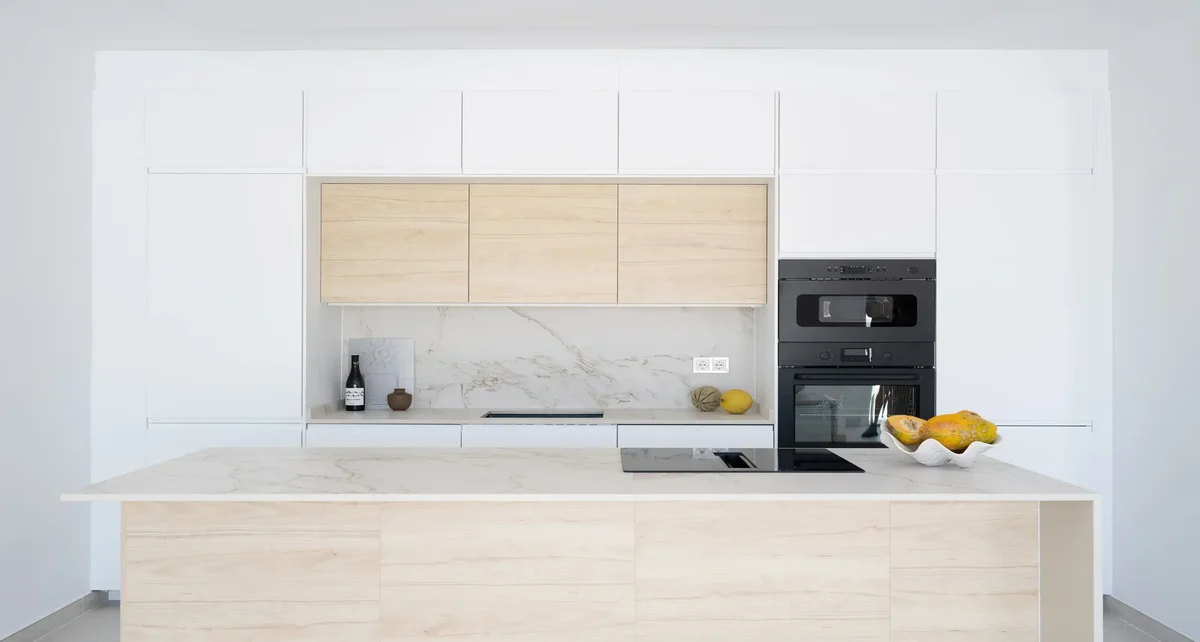 Bij binnenkomst word je verwelkomd door een overvloed aan licht dat binnenvalt door de schuifdeuren van vloer tot plafond, die directe toegang geven tot het uitnodigende terras van 45 vierkante meter. Op het terras kun je niet alleen tot in de late namiddag van de zon genieten, maar ook ‘s ochtends begroet worden door het gouden ochtendlicht dat door de ramen stroomt. Begin je dag met een kop koffie in de hand, genietend van het uitzicht op de kalme Middellandse Zee. ‘s Avonds zie je hoe het licht voortdurend verandert op de bergen aan de horizon en besef je dat een berg gedurende de dag nooit hetzelfde oogt.